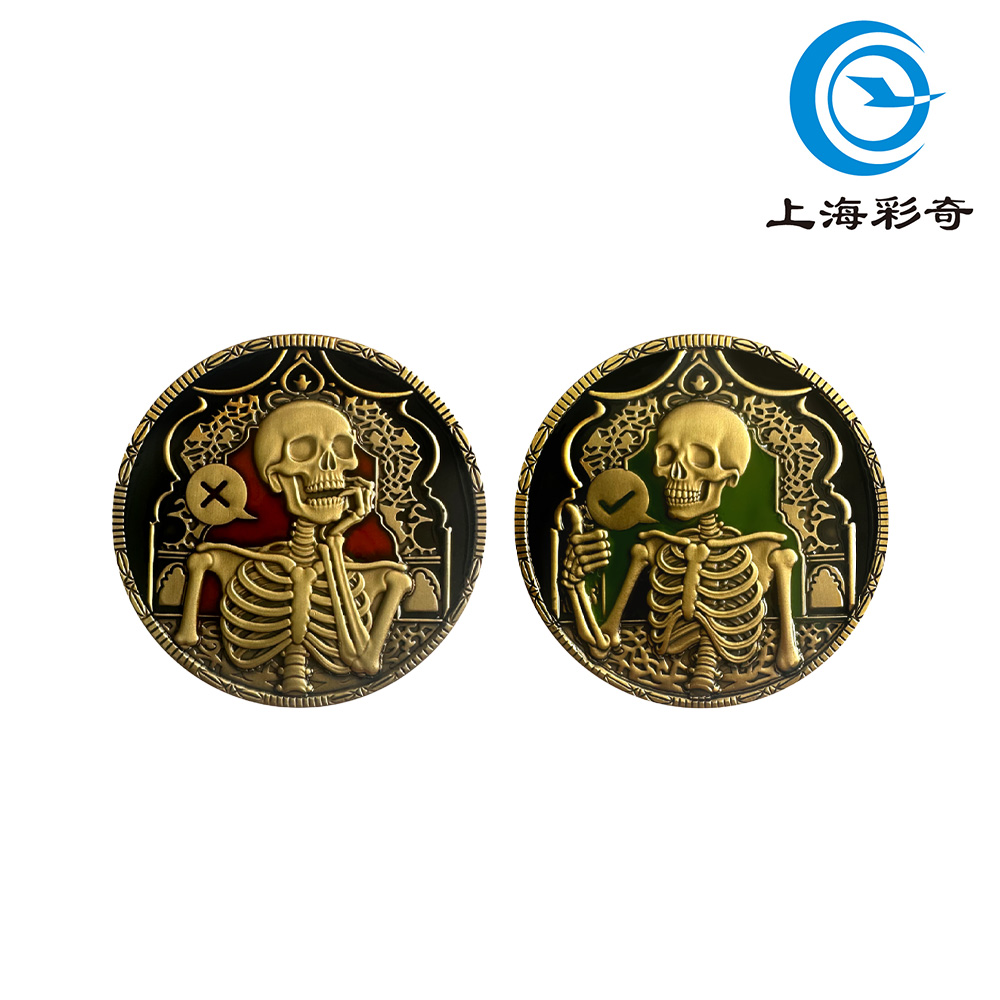 Este capítulo presenta diseños intrincados en ambos lados. Un lado muestra un esqueleto en una pose pensativa con un símbolo "×", que representa la vacilación o una elección negativa, sobre un fondo rojo con patrones ornamentados. El otro lado muestra un esqueleto levantando el pulgar con un símbolo “√”, que simboliza una afirmación o una decisión positiva, sobre un fondo verde con elementos decorativos a juego. Elaborado con atención al detalle, el capítulo exhibe un acabado metálico vintage, contrastes de colores vivos y texturas tridimensionales que realzan su atractivo visual. Su diseño de doble temática (señales de decisión negativas y positivas) lo hace estéticamente agradable y funcionalmente relevante.